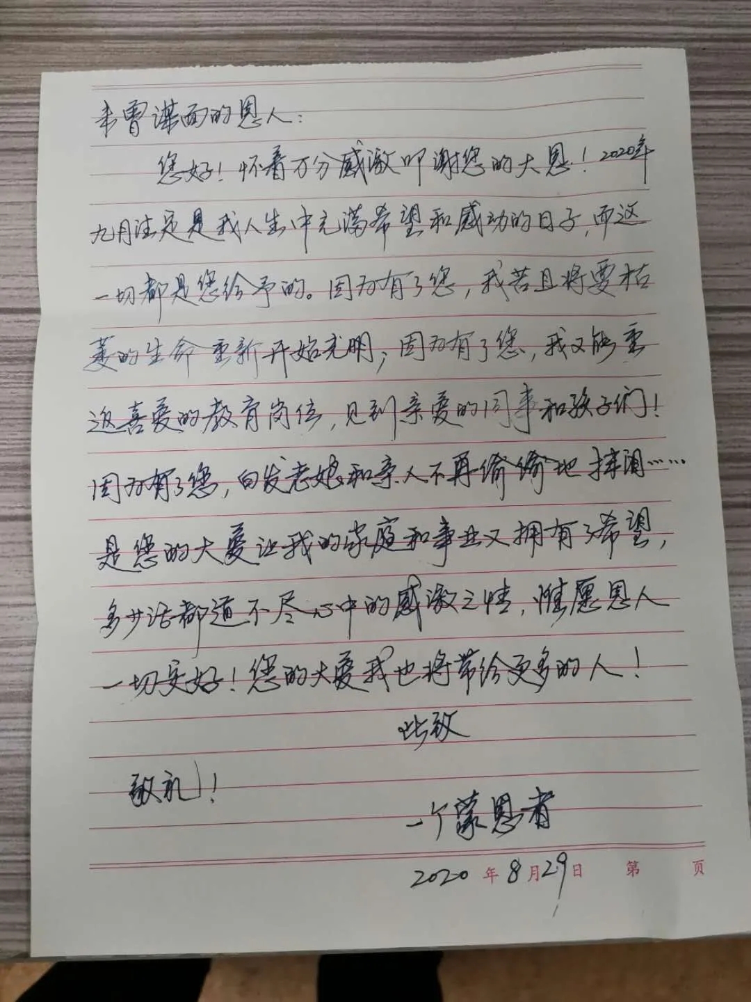 “通過這封飽含深情的信,我得知我的‘有緣人’,是一名老師。在我準備捐獻之前,他還一直堅守在工作崗位上!倍胚鋭忧榈卣f,“我是一名退伍軍人,在部隊中,國家教會了我要以人民的利益為中心,要以人民的安全為使命;在盛世中,董事長教導了我,是社會上的人民給予了我們一切,我們需要常懷感恩之心,要以大愛之心承載社會責任。為此我有義務,也有責任回報社會。”