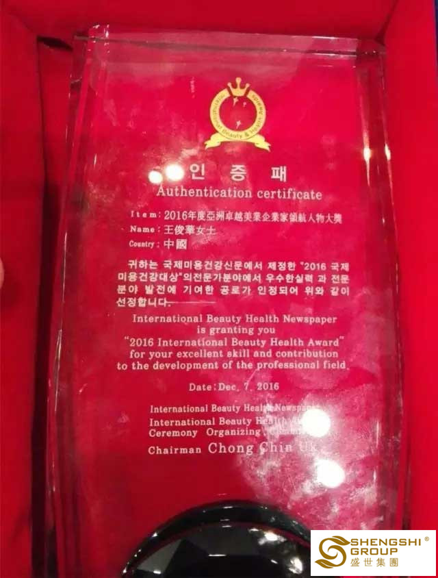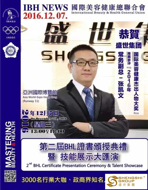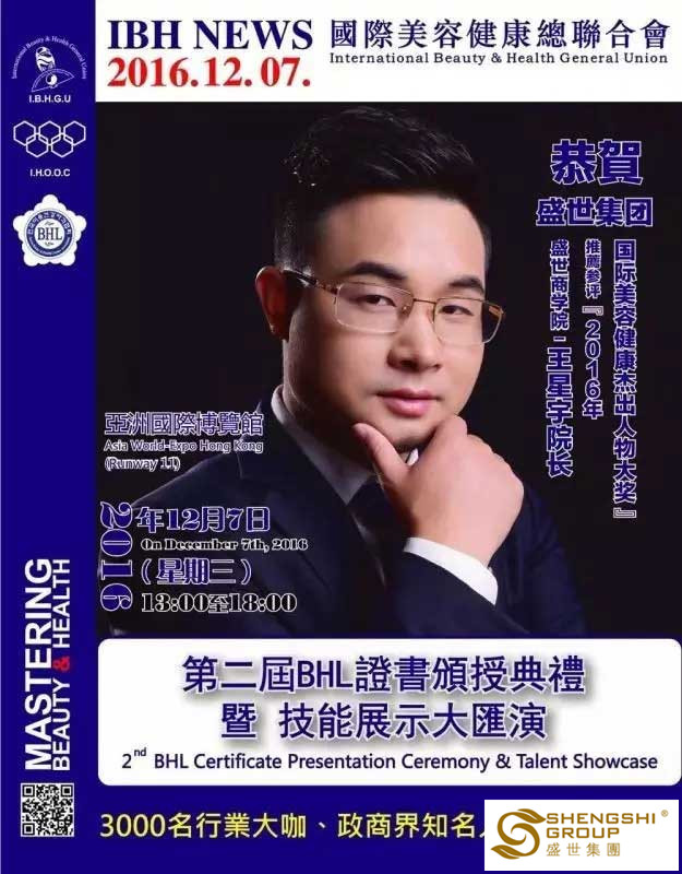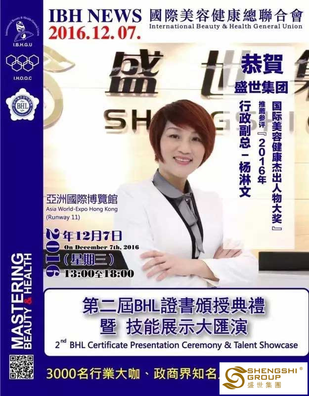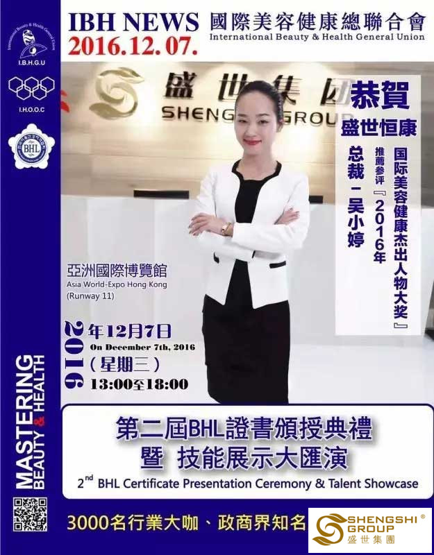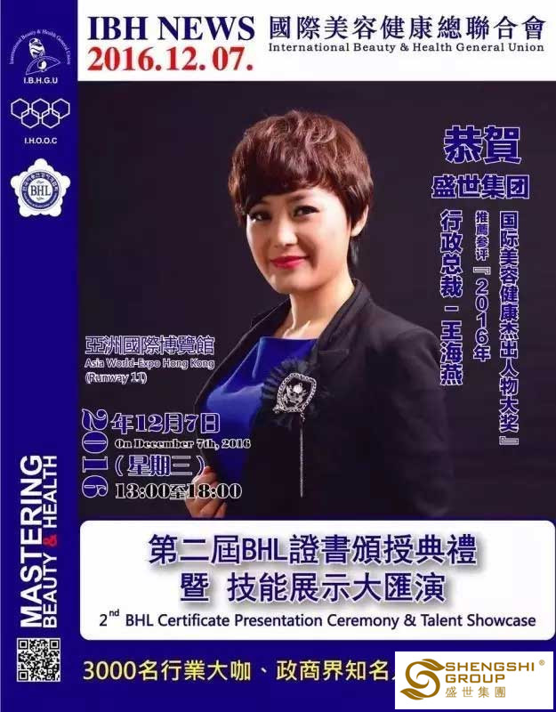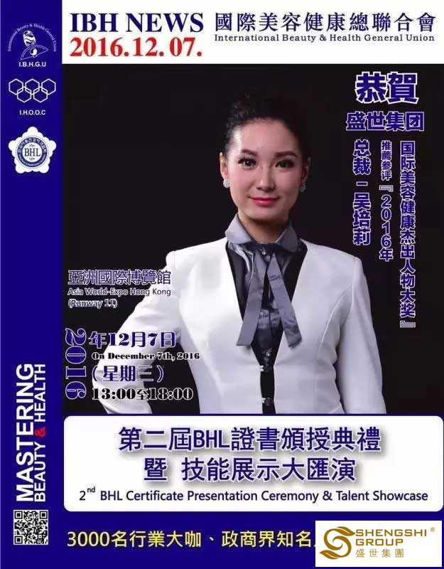 12月7日,國(guó)際美容健康總聯(lián)合會(huì)第二屆BHL證書頒授典禮暨技能展示大匯演,在香港亞洲國(guó)際博物館隆重召開。盛世集團(tuán)高管團(tuán)隊(duì)?wèi)?yīng)邀出席,且盛世董事長(zhǎng)王俊華女士榮獲“2016年度亞洲卓越美業(yè)企業(yè)家領(lǐng)航人物大獎(jiǎng)”,六名高管齊獲“國(guó)際美容健康杰出人物大獎(jiǎng)”!